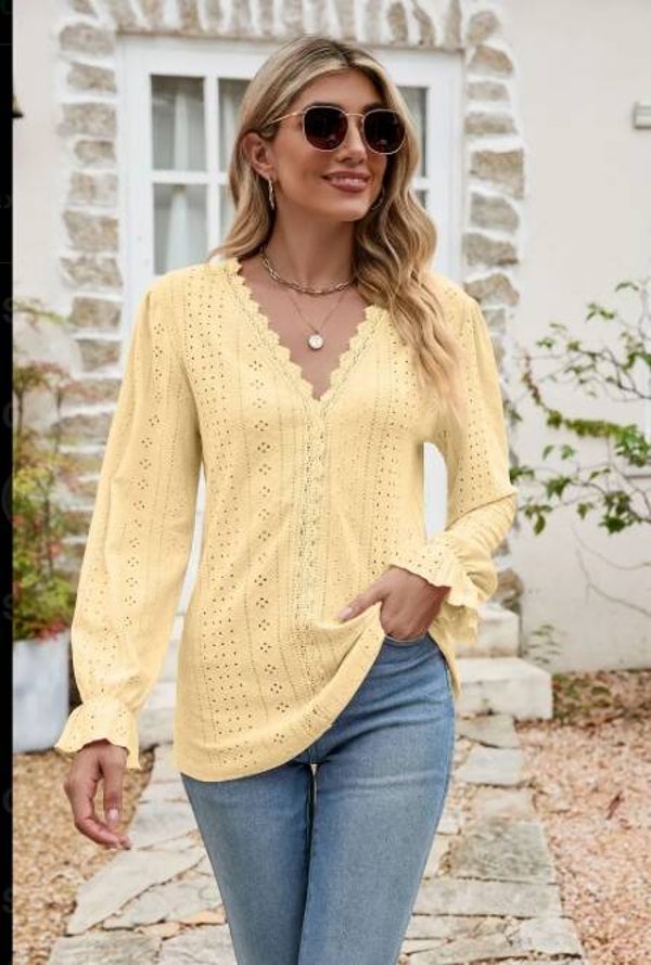 Elevate your wardrobe with our Chic Eyelet Lace Trim Flounce Sleeve Blouse, designed for the modern woman who loves to blend elegance with comfort. This stunning blouse features a flattering V-neckline and long flounce sleeves that add a touch of playful sophistication to any outfit. Crafted from 100% highly stretchy polyester, it offers a perfect fit that moves with you while ensuring all-day comfort. The intricate eyelet lace trim brings a delicate charm, making it ideal for both casual outings and more formal occasions. Easy to care for, simply machine wash cold and tumble dry low to keep it looking fresh. Pair it with your favorite jeans or a sleek skirt for a look that’s effortlessly chic!