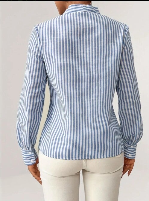 Elevate your wardrobe with our Chic Striped Button Detail Long Sleeve Shirt. Crafted from 100% polyester, this stylish piece features a sophisticated striped pattern that adds a touch of elegance to any outfit. The buttoned design enhances its versatility, making it perfect for both casual outings and professional settings. With its sheer yet opaque fabric, this shirt offers a flattering fit without compromising on comfort. Please note that it has no stretch, ensuring a tailored silhouette. Easy to care for, simply machine wash cold and tumble dry low to keep it looking fresh and vibrant. Add this timeless shirt to your collection for a chic and polished look!