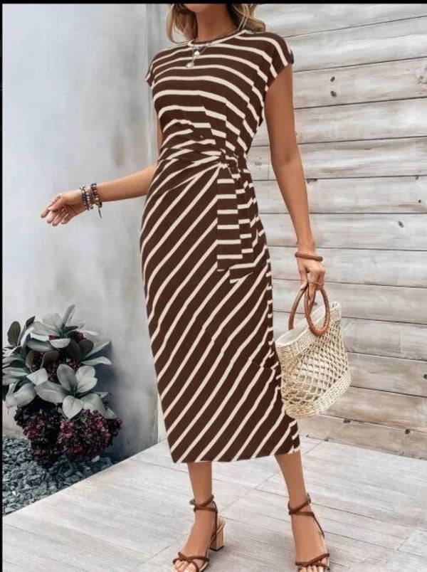 Elevate your wardrobe with our Striped Round Neck Cap Sleeve Midi Dress, a perfect blend of comfort and style. Crafted from a slightly stretchy fabric made of 95% polyester and 5% spandex, this dress offers a flattering fit that moves with you. The classic round neck and cap sleeves add a touch of sophistication, making it ideal for both casual outings and special occasions. With an unlined body, it keeps you cool and comfortable all day long. Easy to care for, simply machine wash cold and tumble dry low. Embrace effortless elegance with this must-have midi dress!