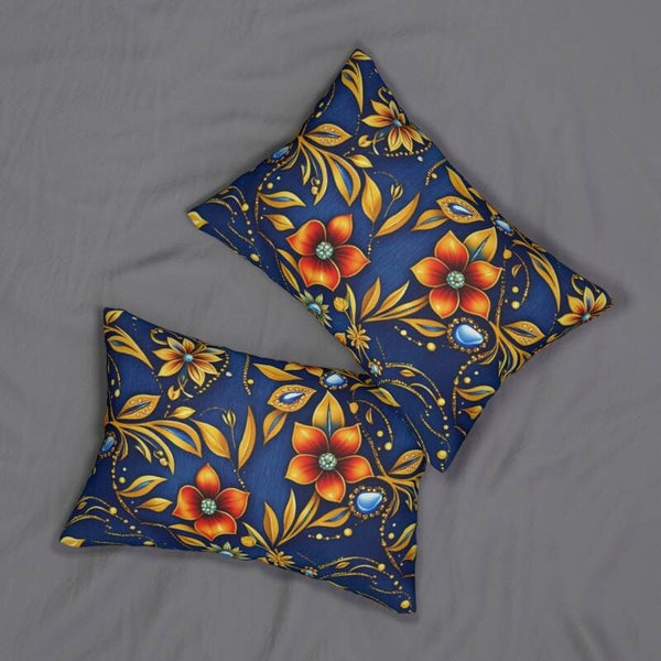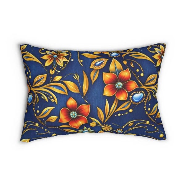 Elevate your home decor with our stunning Denim Color Floral Pattern lumbar pillow, beautifully adorned with sparkling gems. Crafted from 100% spun polyester, this pillow is not only visually appealing but also inherently mildew and water-resistant, making it perfect for any living space. Each pillow comes with a plush stuffing insert included for your comfort. Enjoy the versatility of double-sided printing, allowing you to showcase the same design or a different one on each side. The hidden beige zipper adds a touch of sophistication, ensuring a seamless and stylish finish. Transform your space with this exquisite lumbar pillow today!