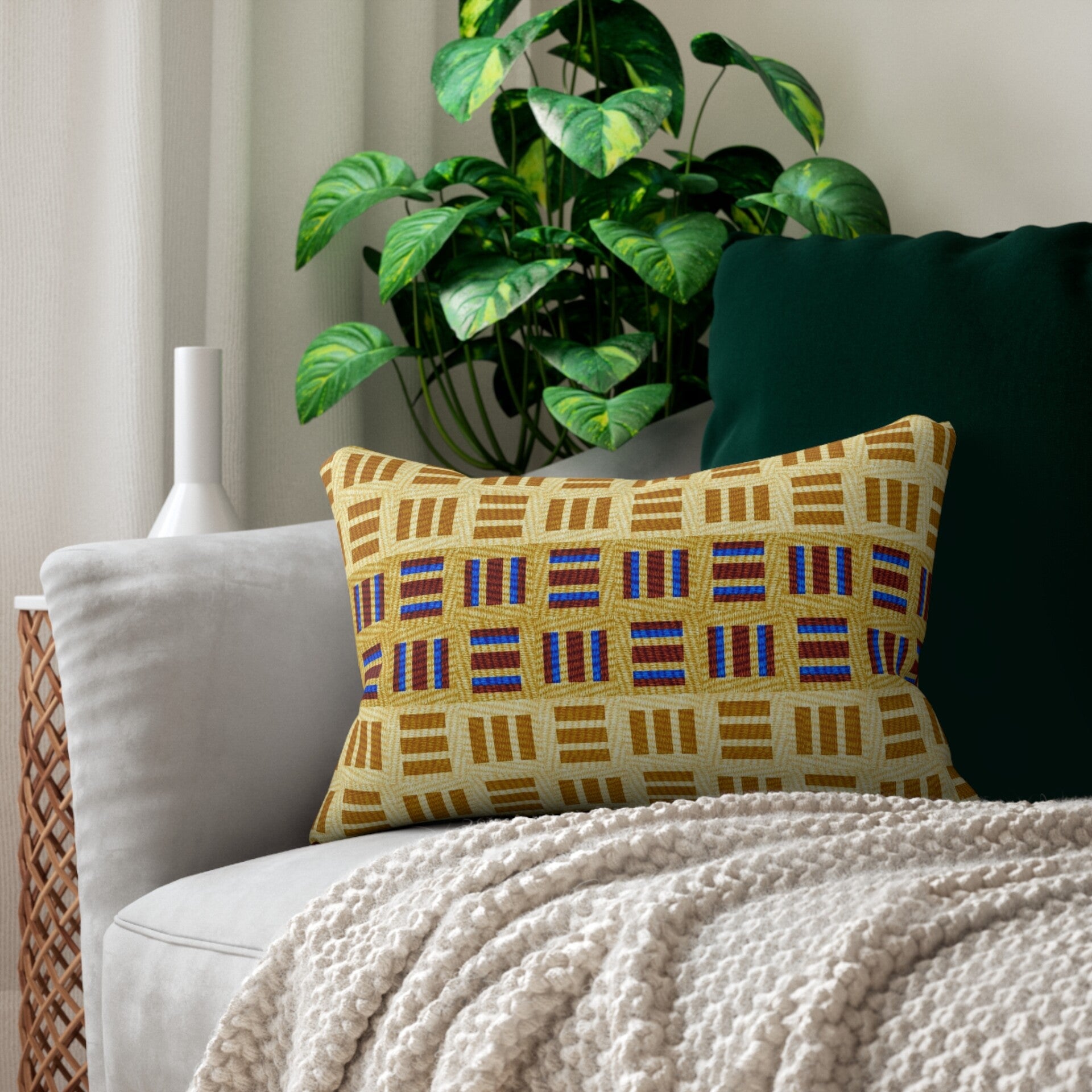 Elevate your home decor with the vibrant charm of our Geometric Pattern Spun Polyester Lumbar Pillow. Featuring a colorful and dynamic design, this pillow brings warmth, texture, and style to any couch, bed, or cozy nook. Crafted with a mildew- and water-resistant 100% polyester cover, it’s perfect for both indoor and covered outdoor spaces.