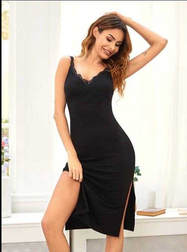 Elevate your loungewear collection with the Sultry Lace Slit V-Neck Lounge Dress. The delicate lace detailing and alluring slit at the front create a sophisticated yet sensual look, while the slightly stretchy fabric offers all-night comfort. This dress is perfect for relaxing in style or adding a touch of elegance to your downtime.