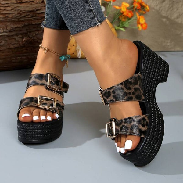 Step into wild confidence with our Leopard Luxe Wedge Sandals by Classy Ballet Flats. These eye-catching open-toe slides feature double buckle straps for a secure, customizable fit and a striking leopard print that brings bold flair to any summer look. The woven-textured platform sole adds the perfect amount of lift while ensuring comfort and stability with every step. Made with durable PU leather and a rubber sole, these sandals are designed for all-day wear—from casual brunches to sunset strolls.
