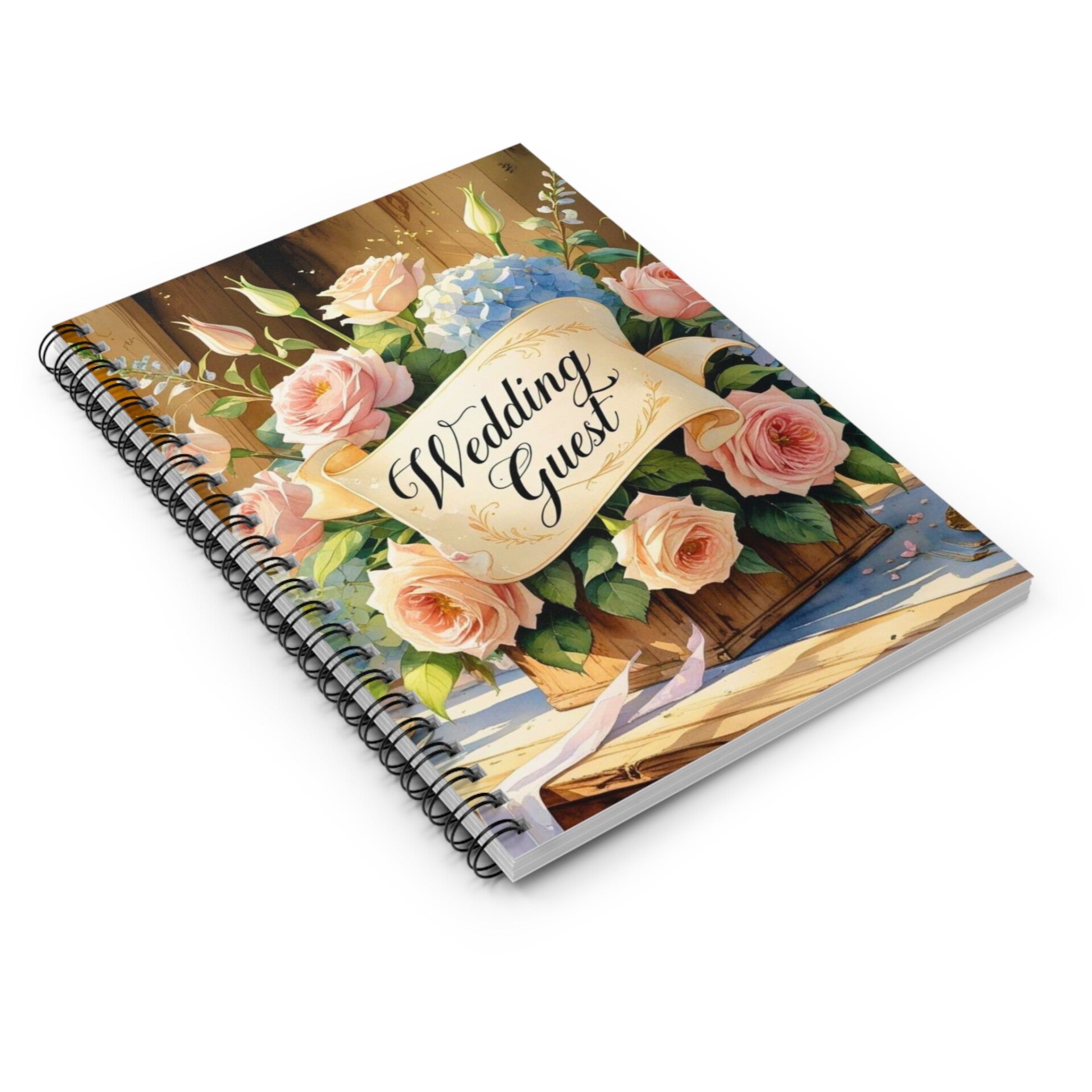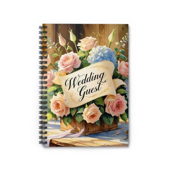 Celebrate love and lasting memories with the Forever Starts Here Wedding Guest Notebook. This beautifully illustrated spiral-bound keepsake features soft pastel roses, delicate hydrangeas, and a timeless scroll banner reading Wedding Guest — perfect for capturing heartfelt messages on your special day. Whether used at the ceremony, reception, or bridal shower, this notebook adds charm and elegance to any wedding setting.