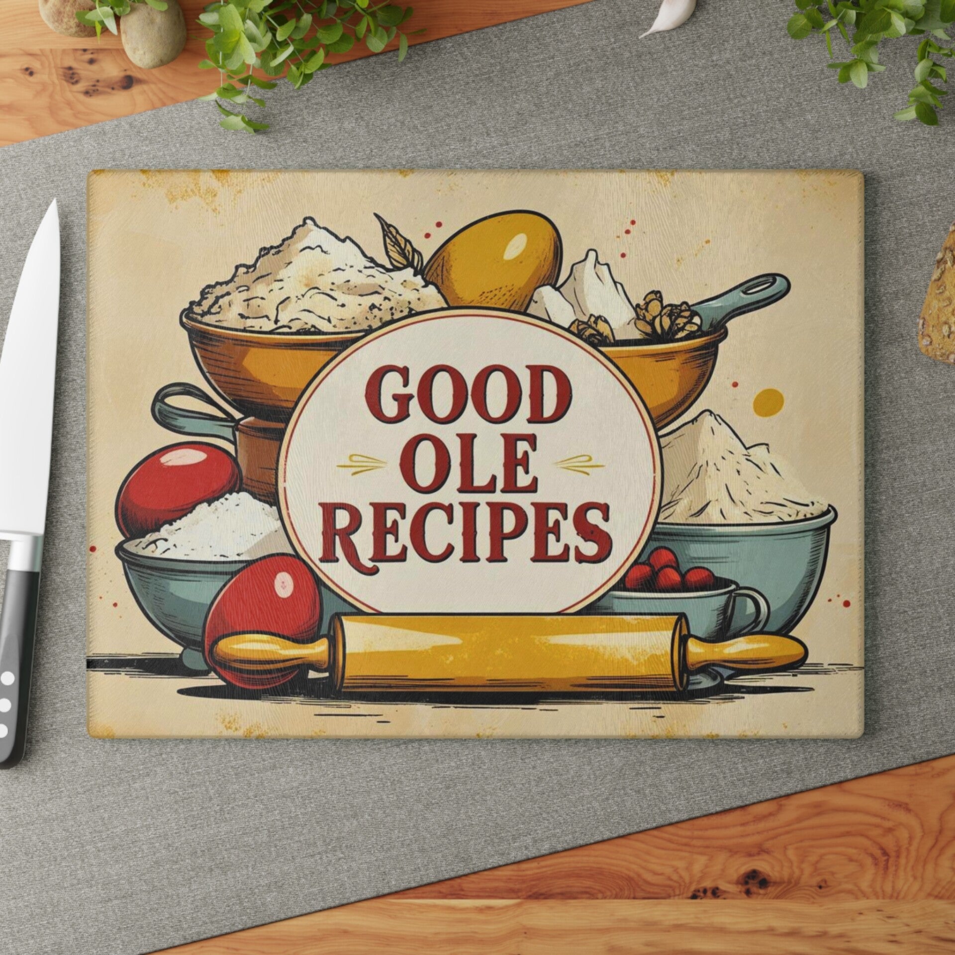 Bring a little Southern charm into your kitchen with the Good Ole Recipes Cutting Board. Featuring a vintage-style illustration of classic baking ingredients and a cheerful “Good Ole Recipes” slogan, this board is both functional and decorative. Whether you're slicing, dicing, or just adding a cozy touch to your counter, this piece is perfect for any home cook who loves tradition with a pinch of nostalgia.