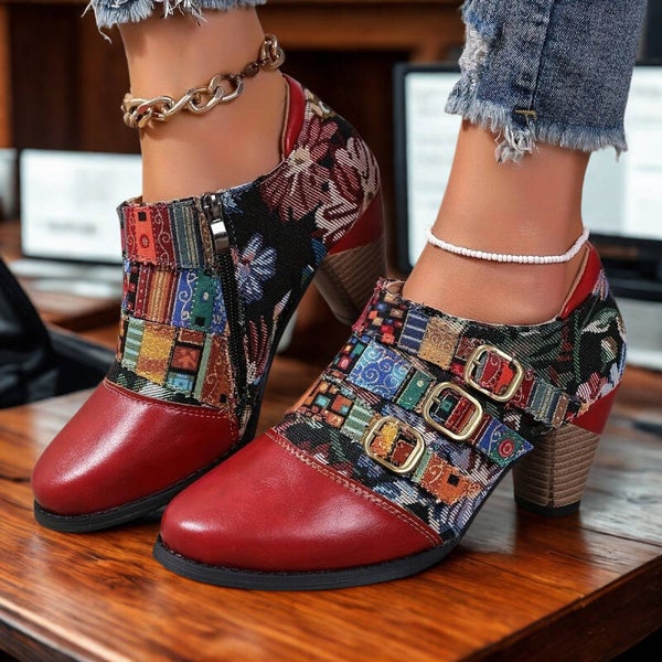 Bring a touch of boho-chic to your look with these Vintage Patchwork Ankle Boots. Featuring bold color contrasts and unique stitching, these mid-heel boots combine comfort with artistic flair. Perfect for adding personality to casual outfits or standing out with statement style. Designed for everyday wear with a true-to-size fit, PU leather build, and a durable rubber sole.